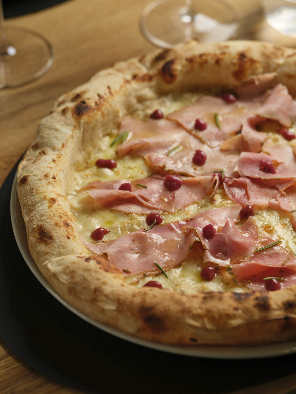 From the custom of cooking roasted chestnuts in the fireplace takes hold the smoky chase of the pizza of the same name, divided between the silkiness of the chestnut cream and the “embers” sensation brought by the smoked cooked ham. In the background (very delicate but present at roll call) pomegranate, an ingredient that would be worth “insisting” on in order to best develop the gustatory chiaroscuro of the recipe.