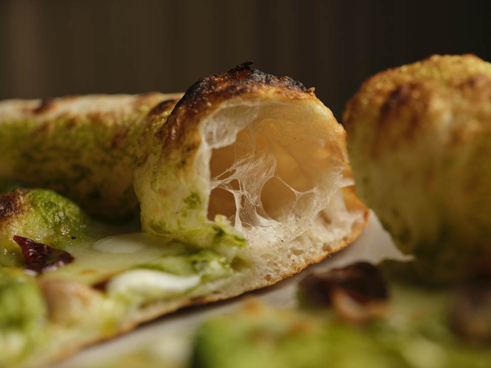 Yes, 5 different types of doughs share the scene in the back, where the team keeps two electric ovens constantly on, “necessary to ‘dry’ our pizza well (made with medium-strength flours from a nearby mill, strictly stone-ground, and hydrated to 73-75%, ed.),” Giammarco and Antonio explain. The result is a natural turnover of fragrances, from the “airy” tension of the slightly crock ledge to the soluble center, while still dodging the dispersion of seasoning thanks to the textured base.