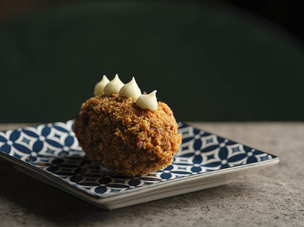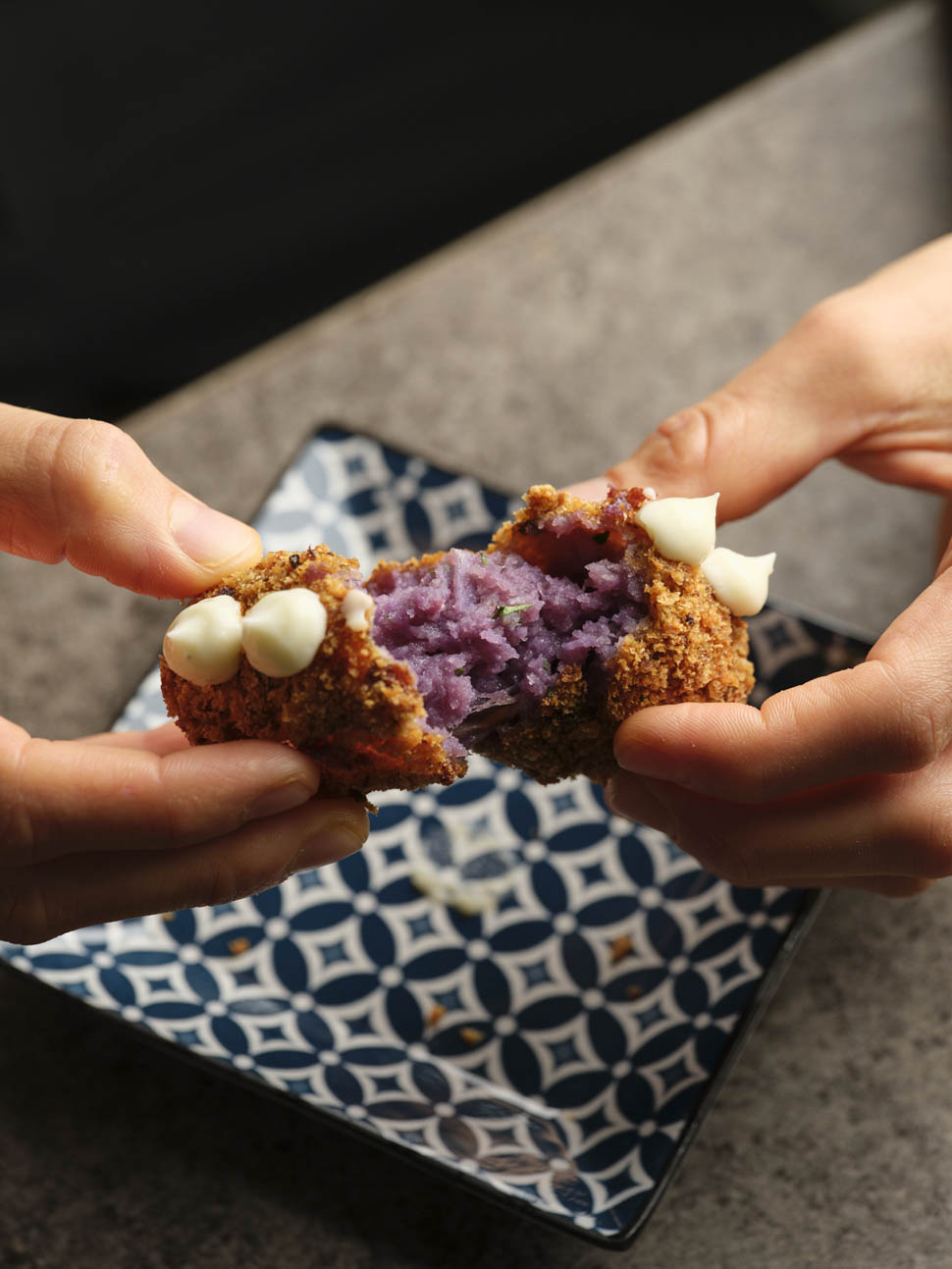 The tastings -in our case, an amalgam between the “Evoluzione di Margherita ” tasting (6 runs at €25, €40 with pairing) and the tastes of the moment- are introduced by the sprightly in-room narration of Claudia Colabono and Perla Santoro, who are able to fully convey the sense of the path conceived by Giammarco and Antonio. An articulated itinerary, according to the tripartition between classic, authentic and author's rounds, plus the bases in the pan and in double cooking, which are flanked by the Roman-style croissant and the trio of montanare to give strength to the “single” appetizers. It begins with the chromatic surprise of Antonio Ruggiero's Purple Potato Croquette, enriched with prosciutto cotto, smoked provola, fior di latte and parsley and made dynamic by the addition on top of Parmigiano Reggiano Dop fondue.