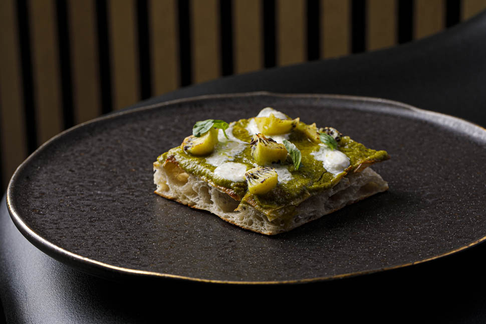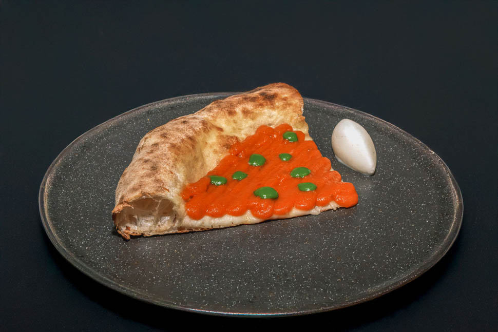 Yet, the highlight arrives along with the only quadrotto pan served in the restaurant: in front of us, Margherita's Illusion, where the stewed kiwi sauce perfectly replaces the datterini by virtue of its pulpy sweetness. “The study of the fruit always starts from neighboring crops, since in the Agro Pontino kiwi abounds everywhere.” Reinforcing the sleight of hand is the total green topping that veers from a veil of cream to basil, while stracciatella gives a velvety wrap that cushions the crunch of the slice under the teeth.