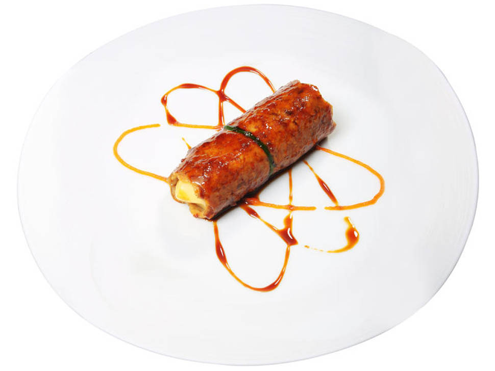 Roll out the rectangular slices of meat (10 x 25 cm) and place the boiled and filled pasta and a little crispy cheese in the center. Gently wrap the meat around the slices and tie with a sprig of chives to form a cannelloni. Wrap the cannelloni again with parchment paper; this will allow them to heat up in the oven without drying out. On the plate, draw two ovals with the roast sauce and one with the tomato sauce. Place the cannelloni on top, upside down, straight out of the oven (190°C for 5 minutes), brushing them with the roast sauce to make them shiny.