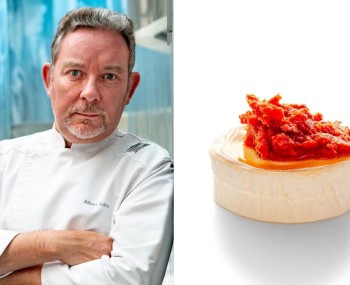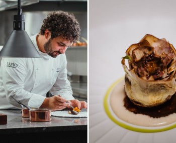 Buonissimo ed elegante nelle sue consistenze calamaro, animella e anacardo: il calamaretto è appena scottato, l’animella di vitello, perfetta, è passata nel jus di carne : vengono serviti su una crema di anacardo con olio al nasturzio ed erbe, sopra il croccante di anacardo. Altro piatto dal gusto seducente è porchetta, baba ganoush, albicocca, caviale e bottarga in cui la pancia del maialino è abbinata alla crema mediorientale; l’albicocca è anch’essa in crema con la carota, per finire caviale e bottarga di muggine con le loro differenti sapidità.