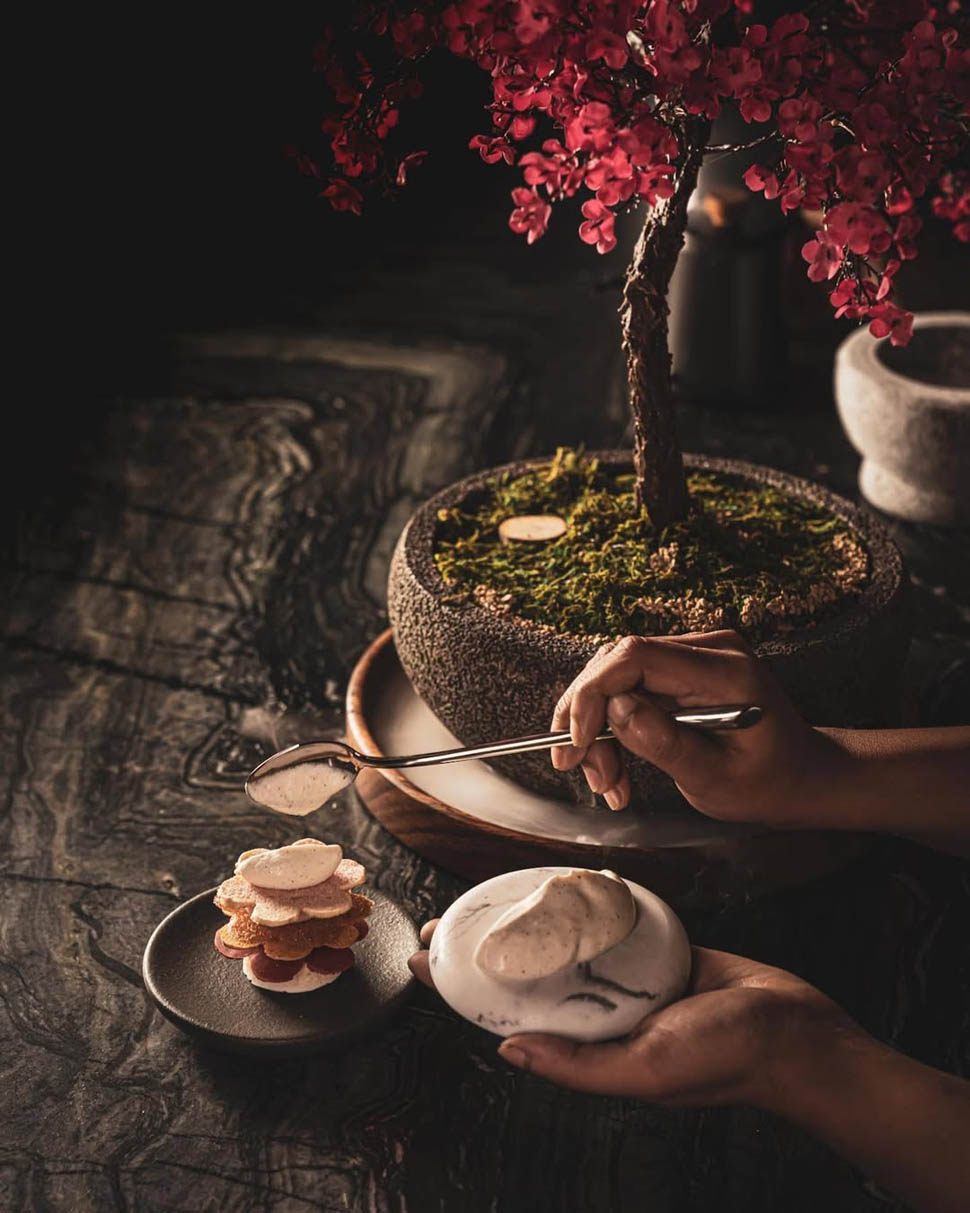 L’alternativa è The Seasons, un percorso in quattro portate ispirato ai ricordi personali della chef legati ai momenti dell’anno. In autunno, ad esempio, si può assaporare un gelato alla ciliegia e zenzero con cioccolato fondente e scaglie di tartufo. Questo menu mette in luce la capacità di Carmen di trasformare le emozioni in sapori, dando forma a memorie personali attraverso ingredienti e tecniche raffinate.
