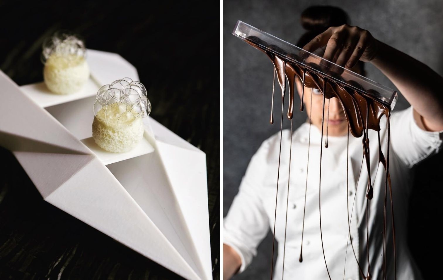 Tra i tratti distintivi della sua cucina c’è la sperimentazione con ingredienti inusuali per la pasticceria, come aglio nero, sedano o alghe. Un’attitudine che deriva dalla sua formazione in cucina salata, che considera fondamentale per innovare nel mondo dolce: “Se la pasticceria e la cucina salata dialogassero di più, nasceremmo tecniche molto più interessanti,” afferma. La sua visione rompe i confini tradizionali del dolce, spingendosi verso un territorio inesplorato e stimolante.