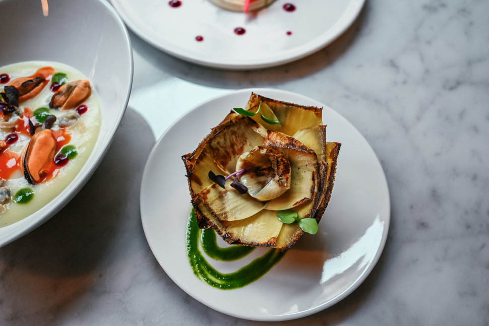Non meno interessante il carciofo cotto prima a bassa temperatura e poi grigliato, accompagnato da salsa al prezzemolo e sale affumicato. Un piatto apparentemente semplice che rivela invece tutta la tecnica dello chef: la cottura sdoppiata permette di preservare la morbidezza del cuore del carciofo garantendo al contempo quelle note tostate e affumicate che rimandano a tradizioni mediterranee ancestrali. La salsa al prezzemolo, vibrante e clorofilliana, aggiunge freschezza, mentre il sale affumicato diventa firma autoriale di un piatto che celebra l'ingrediente vegetale elevandolo a protagonista assoluto.