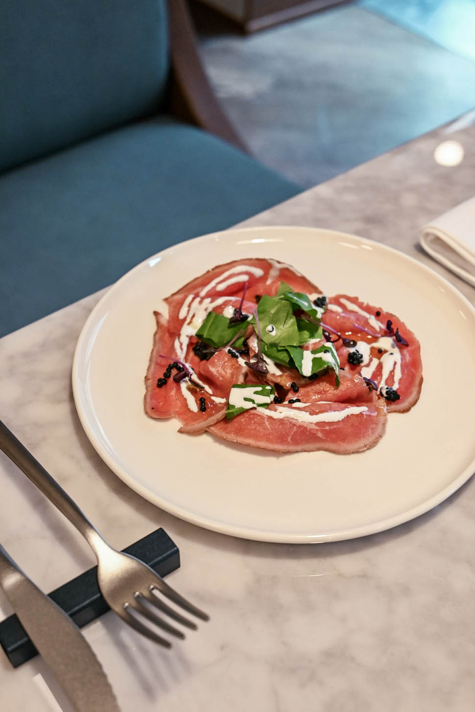Spicca poi il carpaccio di manzo USA leggermente scottato a fiamma viva, servito con caviale di aringa affumicata, acetosa e crema di burrata. Un piatto che incarna perfettamente la filosofia della casa: materia prima impeccabile trattata con rispetto, dove la leggerissima scottatura esalta la marezzatura della carne americana, mentre la burrata apporta quella cremosità mediterranea che bilancia la sapidità nordica del caviale di aringa. L'acetosa, con il suo tocco acidulo, pulisce il palato e completa la composizione.