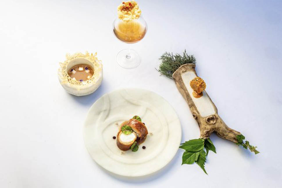 I meloni di Minorca, poco conosciuti fuori dall’isola ma molto apprezzati localmente, diventano protagonisti di un ajoblanco fresco e sorprendente, arricchito da tartare di granchio. Un piatto estivo, elegante e giocoso, perfetto per rappresentare la filosofia di Borrás. Il cuore del menu è però un piatto che mette insieme due simboli gastronomici dell’isola: maialino da latte e aragosta. Una proposta sontuosa e tecnicamente complessa, che sarà anche il piatto con cui lo chef si presenterà alla finale mondiale del concorso San Pellegrino.