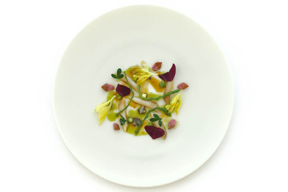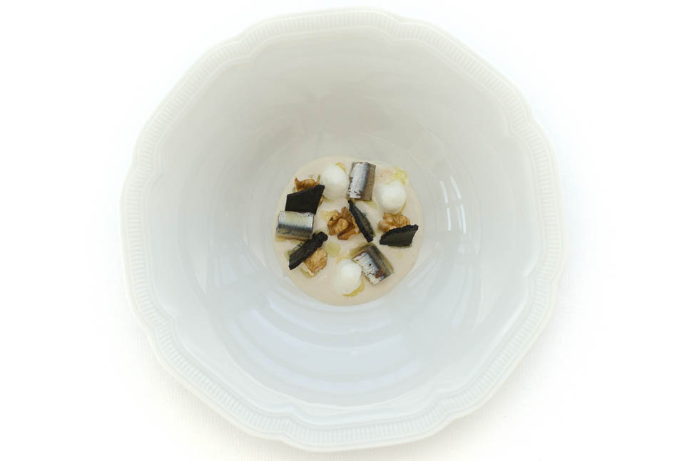 Vi si immergono alici dell’Adriatico, precedentemente marinate sotto sale, con la loro pienezza sapida. Una spuma di luppolo introduce una nuance amaricante di sorprendente eleganza e persistenza, mentre noci lasciate in immersione prolungata in acqua gassata per 36 ore recuperano la consistenza originaria del frutto fresco, ancora avvolto dal mallo. Il risultato è una dinamica masticatoria oscillante tra la vellutatezza del composto lattico, la sapidità carnosa delle alici e il croccante temperato, quasi calloso, della frutta secca reidratata. "Anni fa se andavi al mare la mattina presto, con la bassa marea - racconta lo chef - vedevi file chilometriche di gente, con l’acqua alle ginocchia, china a pescare i cannolicchi. Quelli più acrobatici, facevano come mio nonno Vittorio, che andava dove c’erano due metri d’acqua, si tuffava a candela e li prendeva con le dita dei piedi".