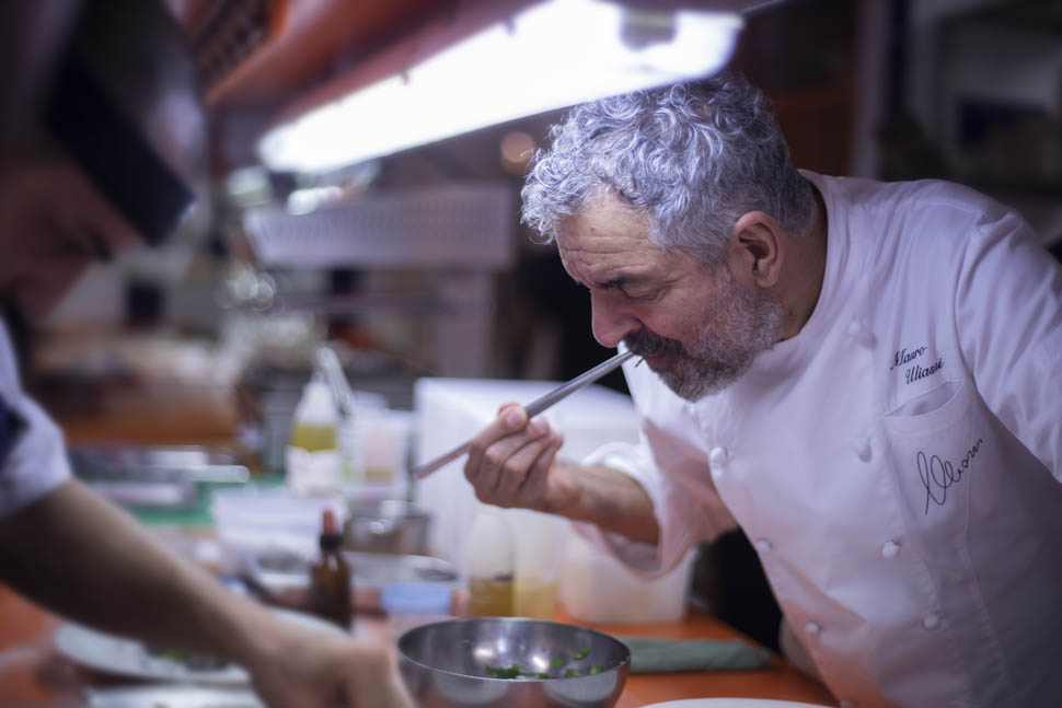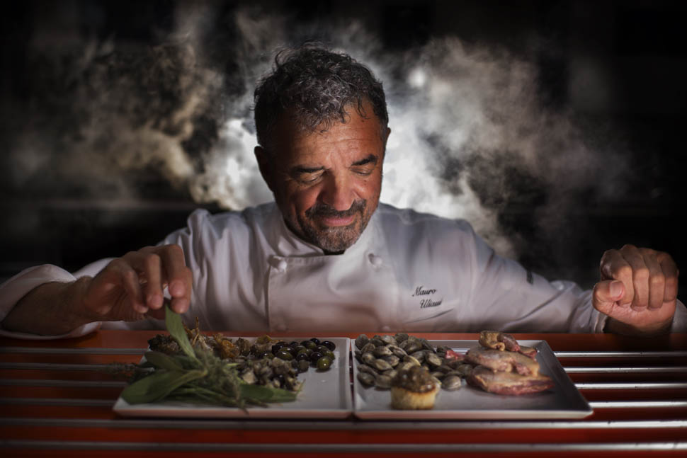 Fra i suoi cristallini talenti, Uliassi ha il dono della narrazione figurativa, così spiccato da far invidia a grandi professionisti della scrittura, con le parole riesce a porgerti una fotografia, anzi meglio, un film di quello che sta raccontando. I suoi racconti del mare, della caccia, della pesca, o della genesi dei suoi piatti rapiscono all’istante e ti teletrasportano dentro la scena che sta raccontando. Il testo postato su Facebook nel 2020, in occasione dei trent’anni di apertura del ristorante, che descrive i primi giorni di lavoro nella “capanna” fra il fiume, il mare e la città, è un concentrato di prosa limpida e serrata così poetica che si legge e si rilegge a ripetizione, con quella sorta di favoloso anacoluto quasi manzoniano che descrive la precarietà dell’edificio ... “se volevi aprire una finestra, era meglio di no”. E alcuni arguti organi di stampa l’hanno ripreso pari pari, senza aggiungere altro, perché nessuno dei loro redattori l’avrebbe narrato meglio. Quest’anno, uno dei piatti è dedicato a Mario Giacomelli e gli spaghetti che portano il suo nome sono preceduti, al tavolo, da una stampa del fotografo/pittore senigalliese e sul retro, Mauro scrive come l’ha conosciuto.