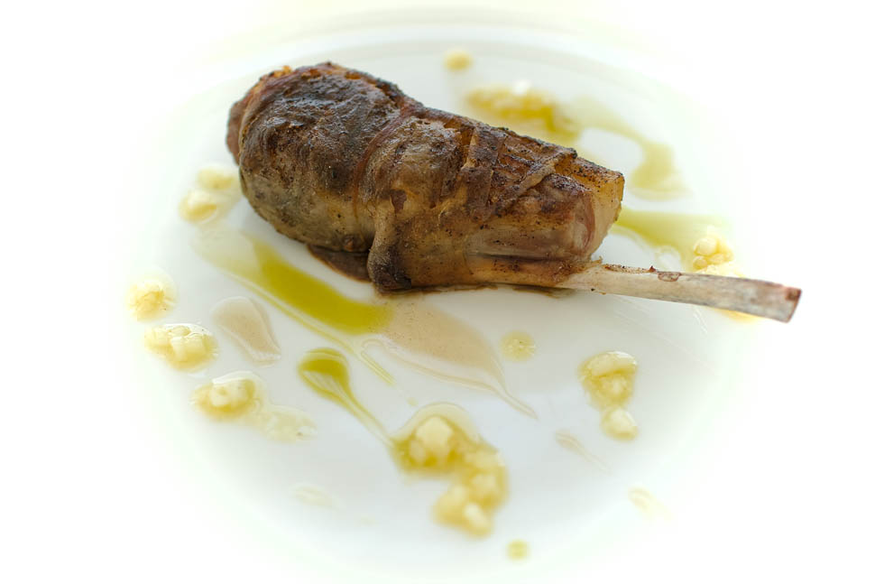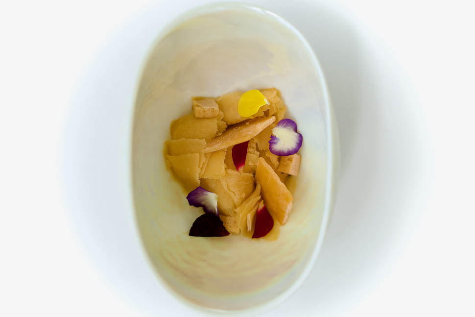 L’agnello viene cotto alla brace con un olio ottenuto per infusione, per 24 ore a 60°C, dalle parti più ossidate, con accenni di irrancidimento, del prosciutto e delle croste lievemente ammuffite di formaggi stagionati, a cui si aggiungono piccoli cubi di pecorino freschissimo, di una settimana, che apporta una dimensione lattiginosa e animale. Viene, inoltre, spennellato con una senape di Digione e avvolto in un velo di guanciale, poi arrostito. Accompagnato, per contrasto, da un chutney di mirtilli disidratati lentamente in forno e legati con una riduzione di succo d’arancia e mirtillo, per riequilibrare la grassezza con una raffica acidula. Il predessert, ereditato dalla passata stagione, è una granita e gelato di albicocche che viene totalmente infervorato da una vellutata crema allo zafferano, piccoli cubi di biscotto disidratato, introducono una componente croccante, in una sinergia avvincente di testure e temperature.