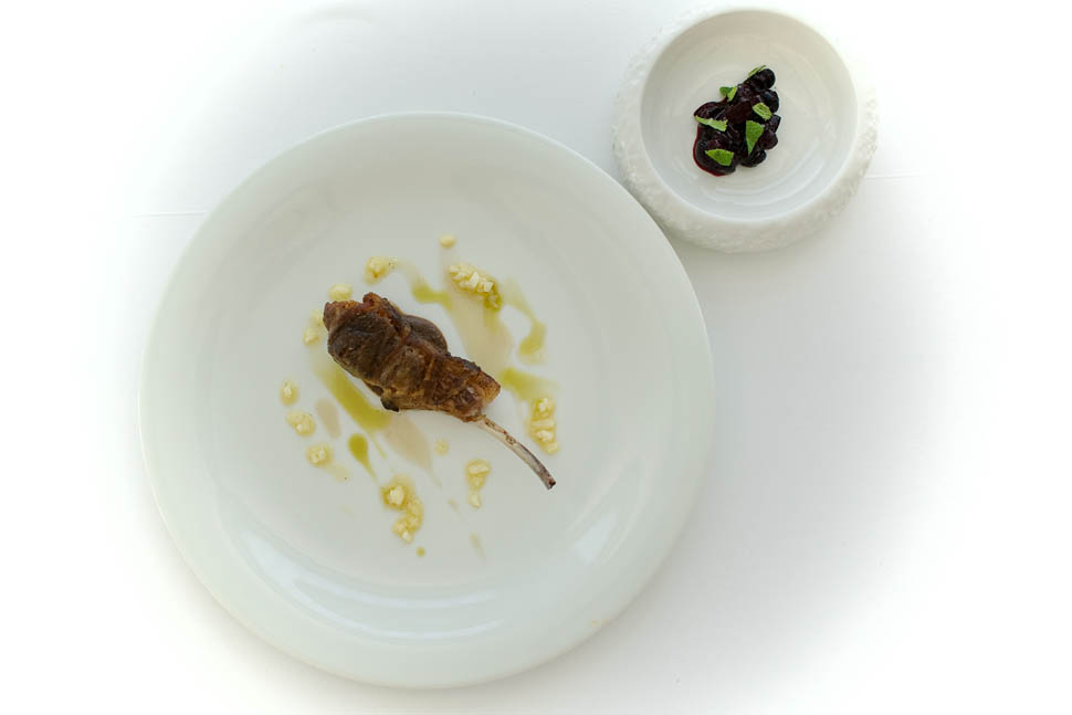 Una grattugiata di limone nero iraniano, essiccato, che sprigiona una nota aromatica penetrante, innesca tutta la potenza gustativa del piatto. Alla fine, sulla porcellana rimane una traccia visiva che evoca sorprendentemente le visioni aeree dei campi marchigiani immortalati da Mario Giacomelli. "Ci imbattiamo sempre più spesso in clienti che chiedono un agnello che non sappia troppo di agnello - racconta lo chef - e questo mi ha scatenato il desiderio di prepararne uno che invece sappia davvero tanto di agnello". Questo piatto rivendica quindi la propria essenza con autenticità, esprimendo un gusto primordiale, senza mediazioni.