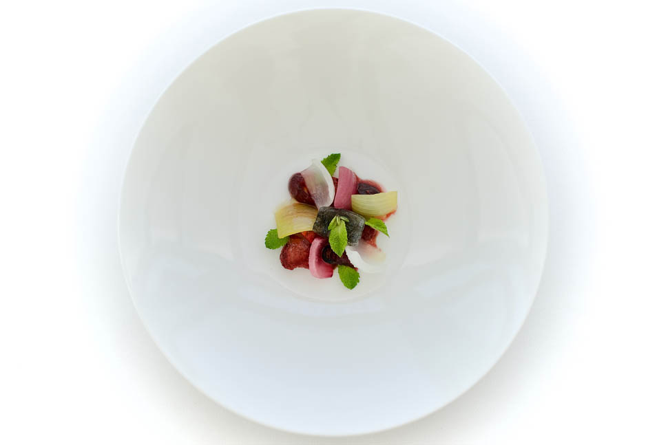 Vengono avvolte e rinfrescate da una emulsione a base di tosazu, salsa giapponese in cui aceto di riso e mirin si rimpallano tra acidità vivace e rotondità. Con un contrappunto fruttato che interviene per contrasto e convergenza: un mélange di fragoline, mirtilli, ciliegie, lamponi e fragole, preventivamente disidratati a bassa temperatura (50 °C per tre ore) per concentrare gli zuccheri e ridurre la componente acquosa, quindi congelati affinché acquisiscano una consistenza fredda ma non vetrosa, elastica, quasi chewy. Un equilibrio cesellato, tra temperature, acidità e texture, in cui la cipolla svela una allure aristocratica mai vista prima.