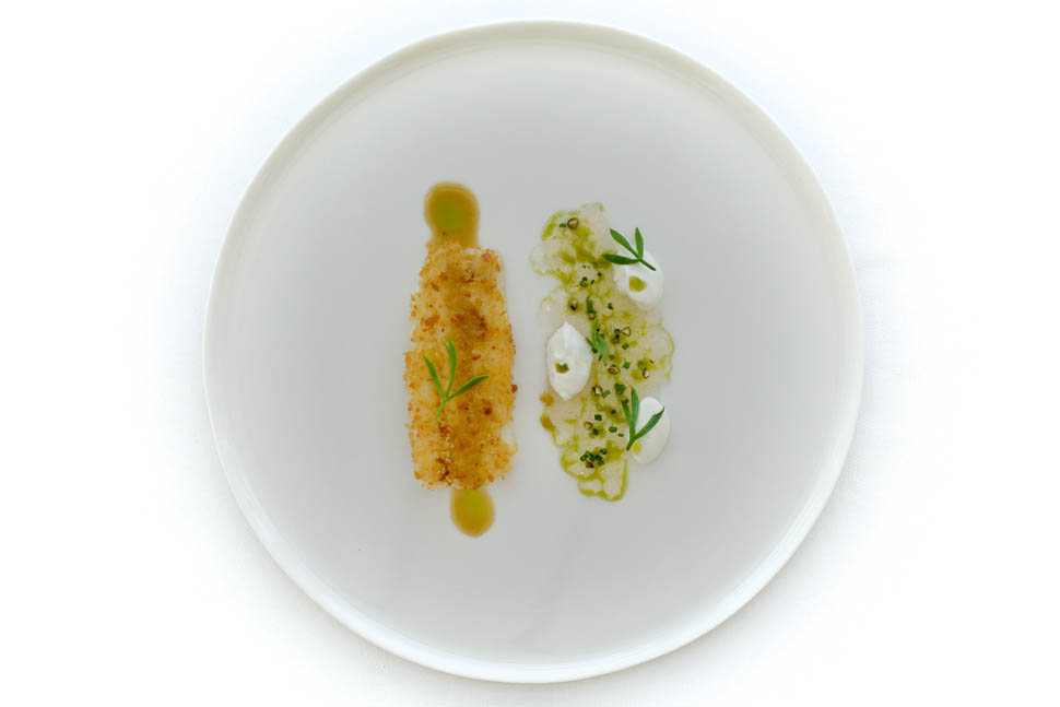 A rendere più vibrante l’attesa delle nuove corse del LAB, la rassicurante certezza dell’aperitivo d’ingresso, il mitologico wafer alle praline di nocciola e fegato, quest’anno di coniglio — accompagnato da uno shot di Kir Royal. A seguire, in una successione calibrata di consistenze, giungono i grissini e il mais soffiato, accostati a un gel all’olio extravergine d’oliva e rosmarino arso, e all’irresistibile burro montato al plancton, alghe e scorza di limone: emulsionato ideale in cui intingere le fragranze panificate della casa — dal pane ai grani antichi a quello alle alghe, dalla pizza al formaggio ai crackers impreziositi da semi. Il milk shake di aringa prende forma da un’emulsione di latte di mandorla e burrata, montata fino a ottenere una tessitura lattiginosa, ariosa, ma strutturata che vira all’affumicato, grazie all’aringa.