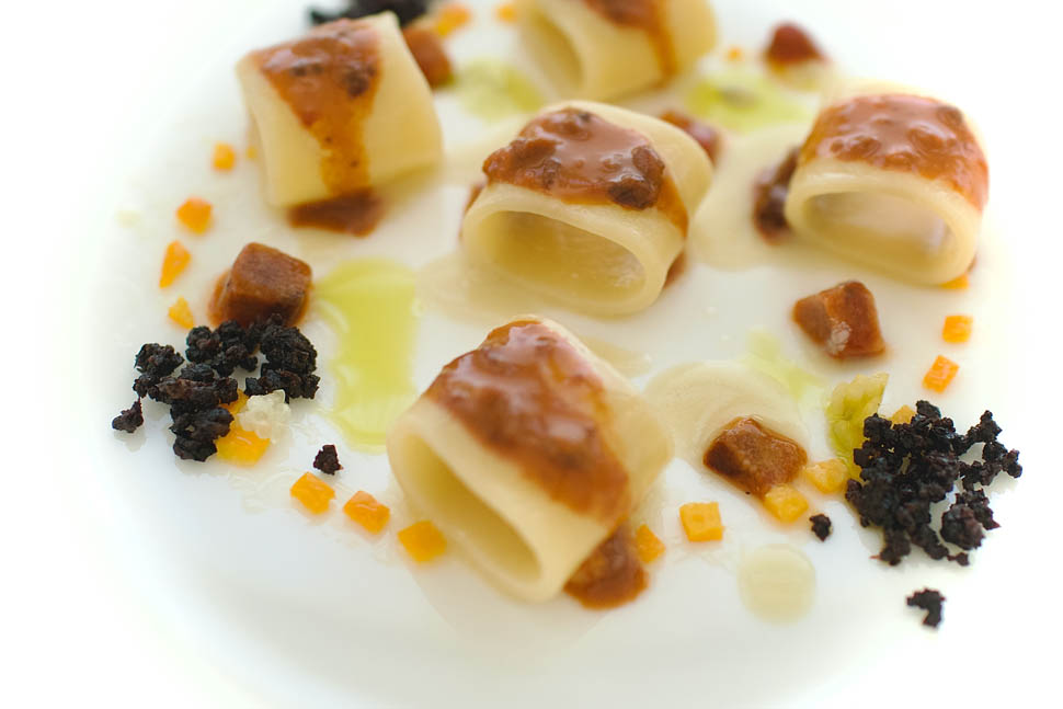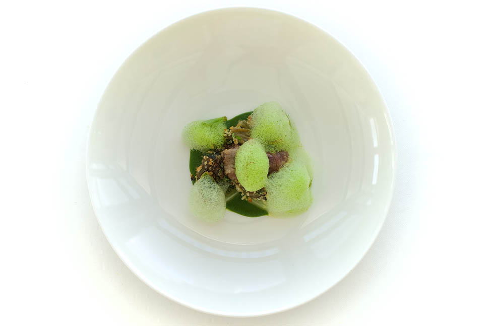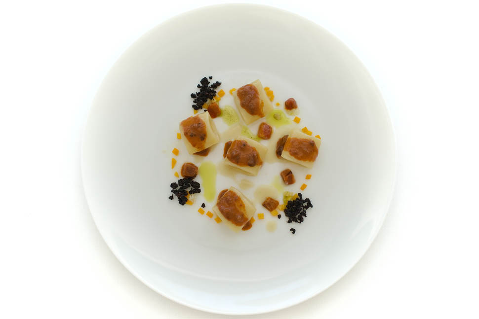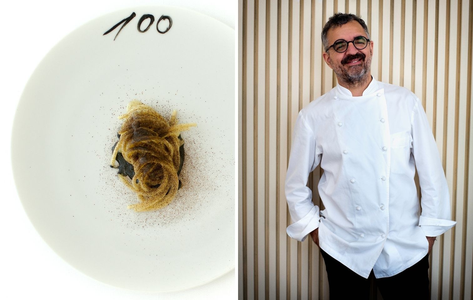 Entrambi espressioni di una natura rude, vengono cotti alla brace, che ne sottolinea la ferrosità, e disposti su un fondo di crispigni, leggermente amari, con una spuma al prezzemolo, coste di lattuga e l’elettrizzante croccantezza acidula delle foglie di begonia. Musa ispiratrice di una pasta indomita e magnetica è Chantal, moglie dello chef, che adora i ricci di mare. Quindi mezze maniche di Massi, che non subiscono la prevaricazione della mantecatura, ma vengono avvolte, una volta sul piatto, nella burrosità fenica e metallica dei ricci, un estratto e bucce di mandarino e bergamotto, fingerlime, una polvere di olive nere essiccate, dell'olio al ginepro e allo shiso. Una spigolosità gustativa, fra acidi agrumati e amari stoici, capace di esercitare un'attrazione crescente al palato.