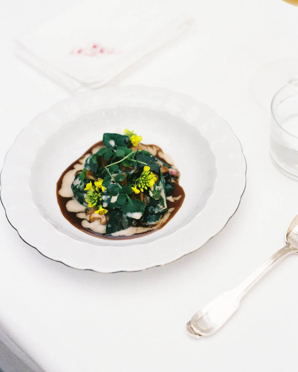 Il menu, disegnato su misura da Deborah e scritto a mano nella lingua preferita di ogni ospite, si muove nel solco di una cucina francese riletta con occhio nordico e spirito contemporaneo. Qui niente è lasciato al caso, ma tutto è sussurrato. L’infuso di magnolia, uno dei simboli olfattivi dell’esperienza, ne è la perfetta metafora: è presente, intenso, ma non invadente. E racconta un modo di intendere la gastronomia che predilige il gesto all’effetto. La materia prima è rigorosamente stagionale, locale e — quando possibile — autoprodotta. I fornitori sono gli stessi con cui Deborah, Brend e Nebo avevano già collaborato al Willem Hiele, rinomato indirizzo gourmet del nord della Spagna. La selvaggina e il pescato del Mare del Nord si alternano ad alghe, cavoli, piselli, spinaci, asparagi: ingredienti che la mano degli chef trasforma senza travolgere, rispettando consistenze, colori, memorie.