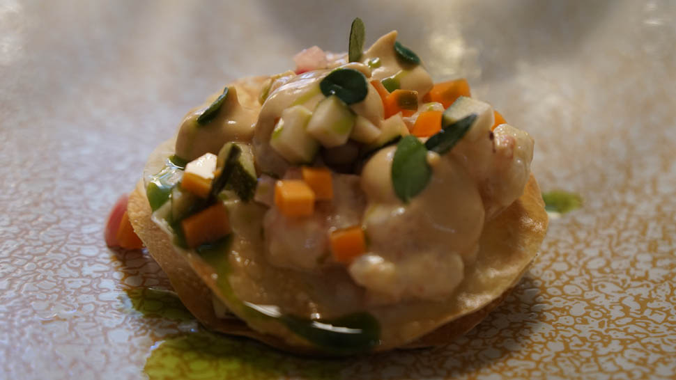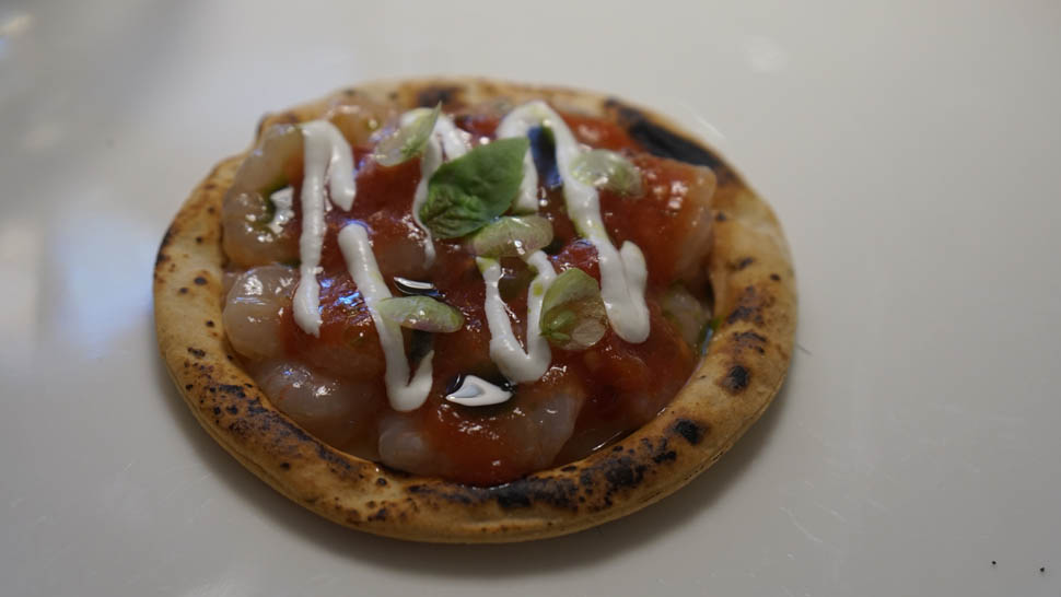 La tartare di spigola con yogurt, Citra Leaves, uova di salmerino e di aringa è un riuscito gioco di contrasti tra dolcezze, sapidità e piacevolissime note acidule. Divertente l’interpretazione di Picchiotti del cocktail di gamberi croccante con Sansho Leaves, che con una sorta di effetto ‘elettrico’ e agrumato danno leggerezza e freschezza al piatto.