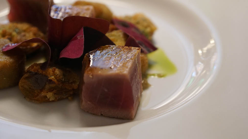 Di grande succulenza il tonno ‘di corsa’ con pepite di melanzane, pomodori gratin e Yka Leaves ad allungare con una preziosa nota aspra. Si termina in dolcezza con l’ottima meringa al limone con fragole e panna e il contributo di leggera piccantezza di Bicolor Mustard Cress.