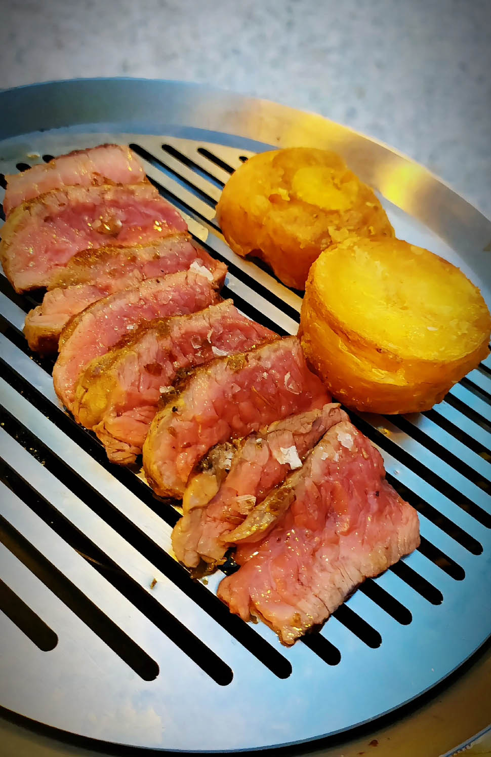 Fuori menù “Vacca alla brace”, un piatto da provare per comprendere un concetto importante. Questa fesa di spalla alla brace, spennellata con tallow sciolto, rappresenta uno degli obiettivi principali dello chef Poggi: “Io non uso animali allevati per il consumo. Utilizzo vacche provenienti dalla filiera del latte, collaboro con selezionatori esperti: la vacca produce latte e una carne magra e asciutta. La carne viene frollata per cinquanta giorni complessivamente, il pascolo aiuta a infiltrare i grassi mentre la frollatura serve ad asciugarla. Per la stagione estiva, data la siccità tipica della nostra zona, scelgo vacche alpine, sempre della filiera del latte.”
