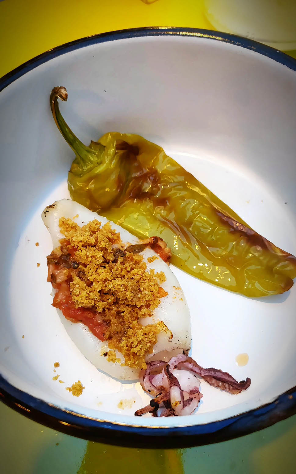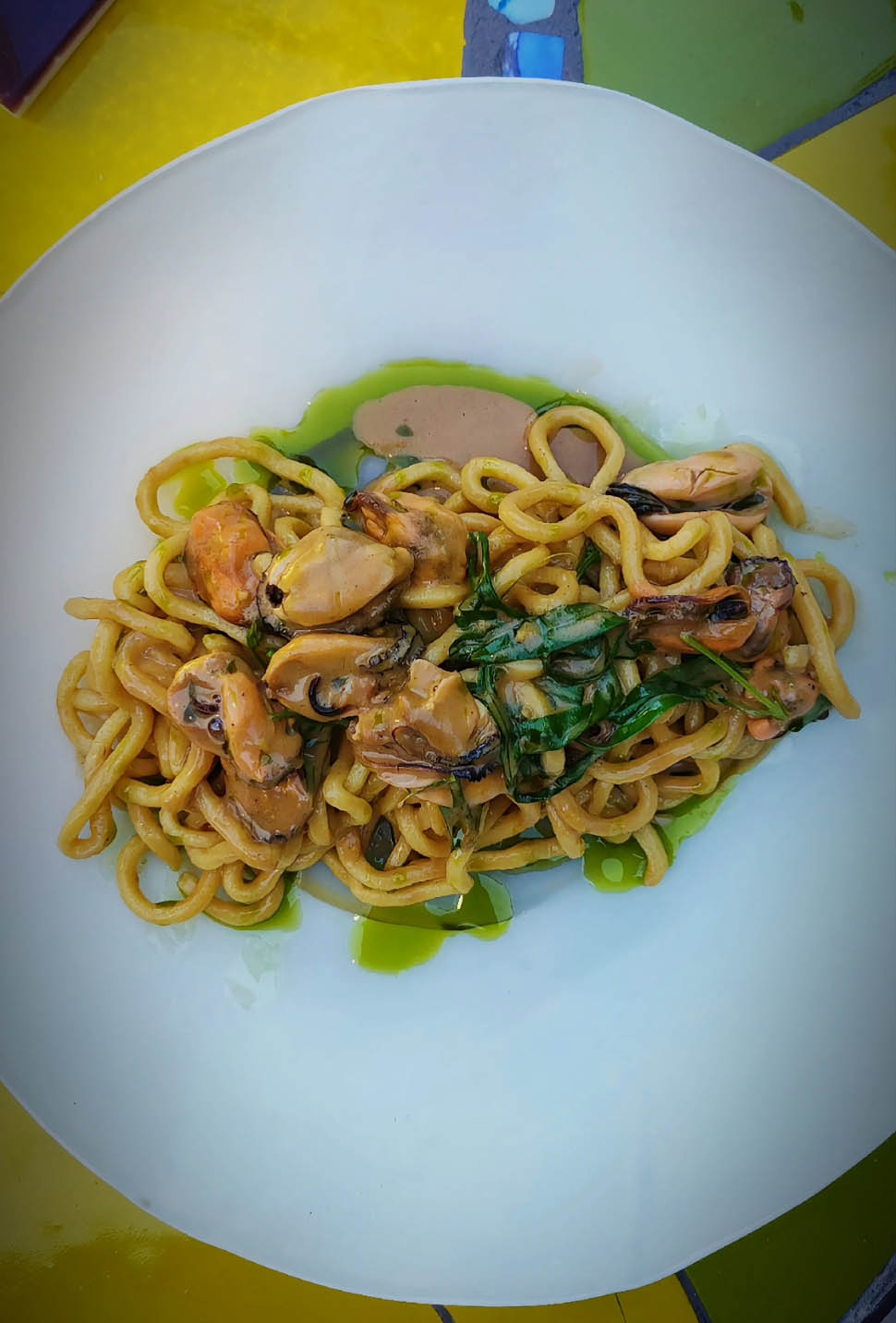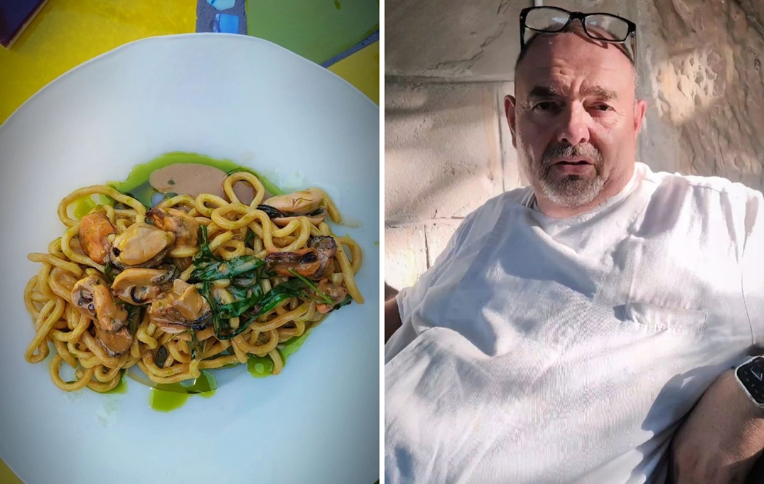 “Chitarrina all’uovo alle cozze dell’Adriatico” è il primo piatto proposto, semplice ma con carattere, che rappresenta la cucina mediterranea con ingredienti autentici e un gusto deciso. La sua forza sta nella chiarezza dei sapori e nella genuinità degli elementi utilizzati. Questo percorso di tradizione e ritorno alle radici continua con il “Calamaro alla brace con insalata di patate” semplice ma che non cede il passo al tempo, accompagnato da erbe di campo fresche: portulaca, amaranto, farinello e ciuffetti di carote.