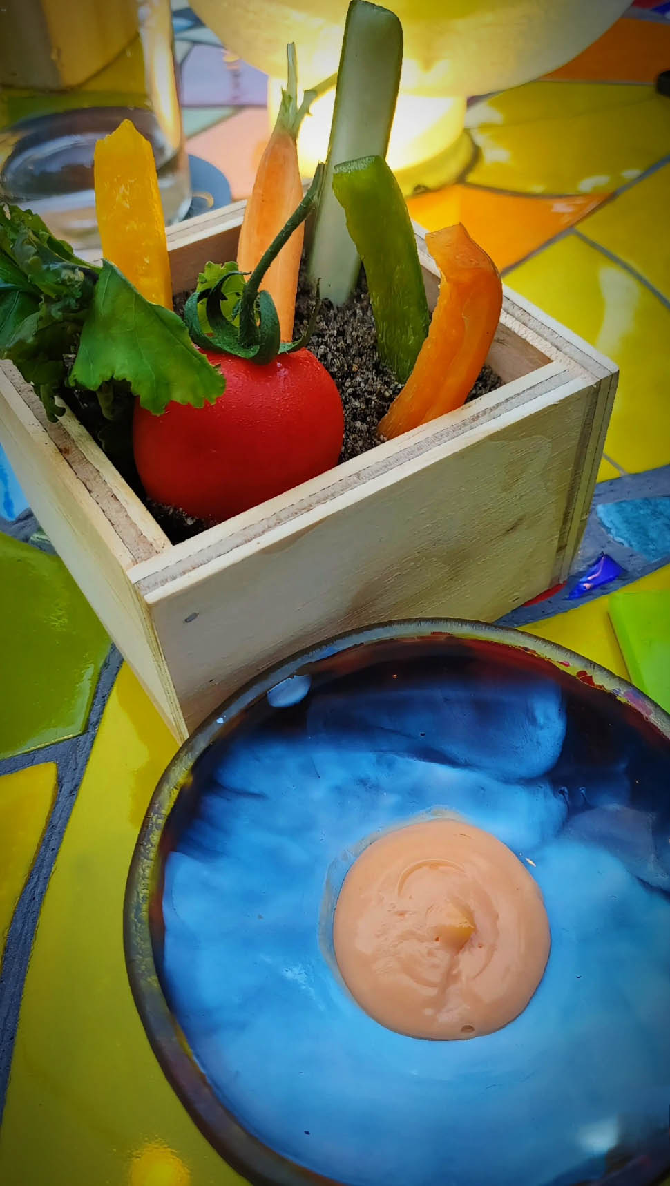 Il “Benvenuto della Cucina” è un Pinzimonio servito in chiave originale, come un piccolo orto in tavola: verdure freschissime in una “Terra” composta da olive nere, pangrattato e Parmigiano Reggiano, accompagnate da una delicata crema di peperoni dolci.