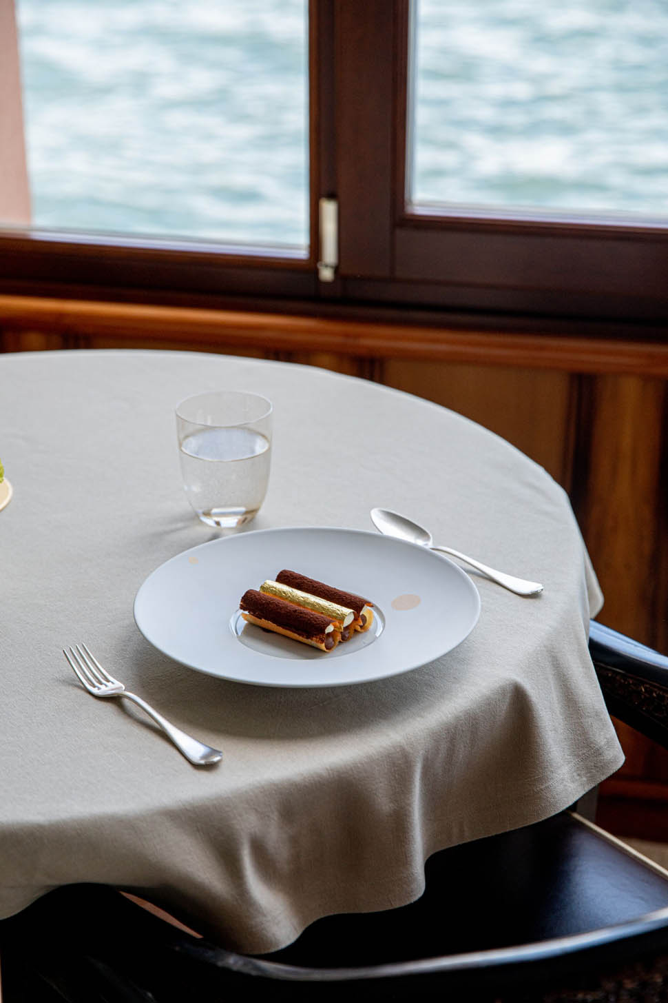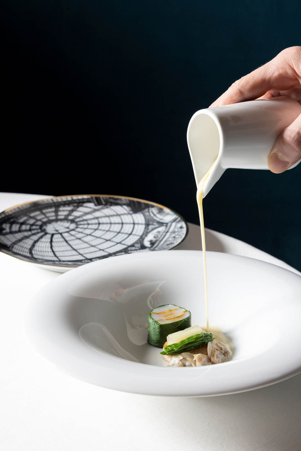 Il viaggio in Laguna è stato un alternarsi di piatti tra Ghedini e Guida, in uno scambio piacevole e raffinato di punti di vista e visioni. Dopo un aperitivo servito nella Terrazza San Giorgio, con gli amuse bouche - tra i quali emerge l’ostrica fritta - ad aprire la cena è stata la padrona di casa con “Laguna”, un chawanmushi che si ritrova a Venezia e raccoglie il profumo di mare. In abbinamento il Brut Teatro alla Scala 2020. A seguire l’elegante Capasanta con bieta, cavolo rapa in crosta di sale, salsa al cedro e aneto di Antonio Guida, a regnare è l’equilibrio e il gioco tra consistenze e acidità, in questo caso è stato abbinato con un Blanc de Blancs 2016.