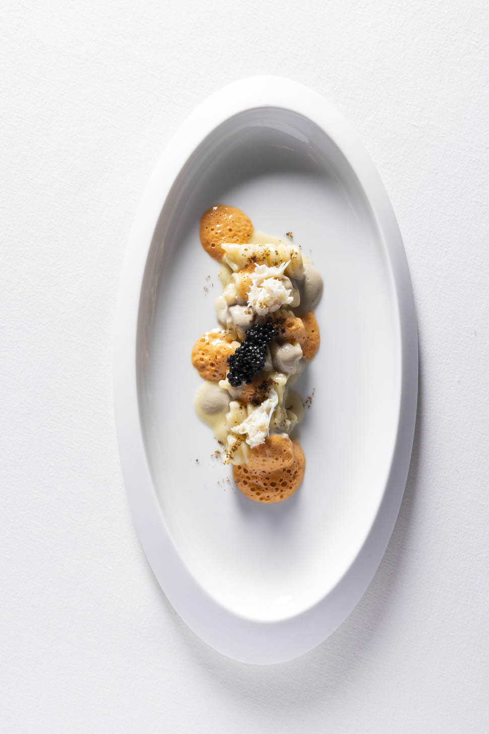 Dopo aver navigato in rada, si inizia a prendere il largo con due piatti con il carboidrato come protagonista: una pasta per guida e un riso per Ghedini. Ecco allora il Fusilloro con sugarello arrosto, caviale, granciporro e ginepro, una preparazione che abbraccia il mare e la terra, in questo caso abbinato con la preziosa Riserva Vittorio Moretti 2016.