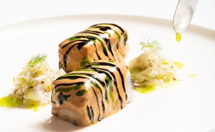 Impiattare, accompagnando con l’insalata tiepida di finocchi precedentemente condita con il dashi al limone e qualche goccia di olio al prezzemolo.