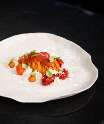 Comporre il piatto come da foto copertina, disporre sul fondo i noodles, a seguire la gelatina al nero di seppia e quella all'arancia e infine sifonare la spuma di Parmigiano Reggiano in cinque punti differenti.